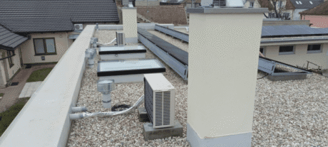 Novostavba dvou rodinných domů ve městě Břeclav, trasování potrubí v ploché střeše.