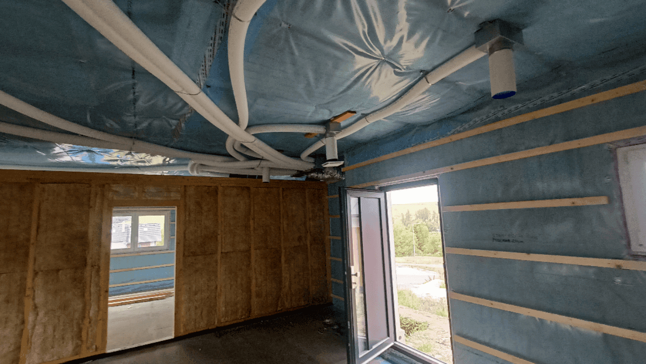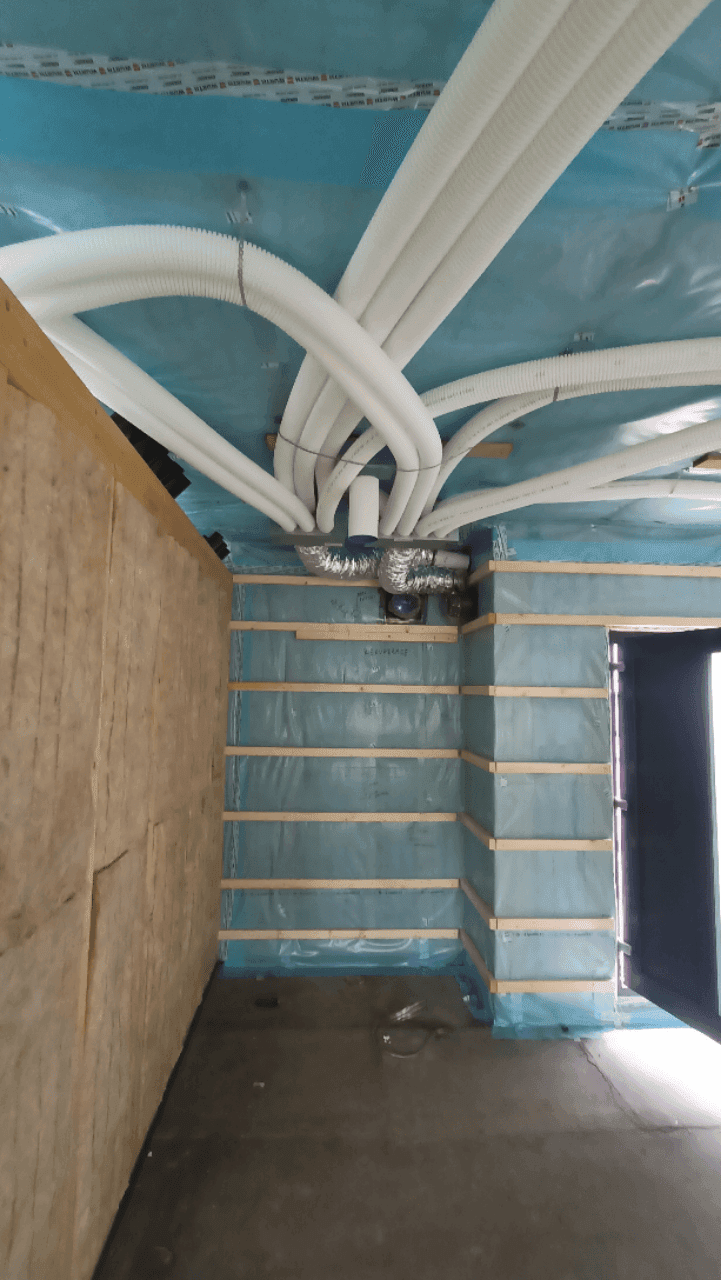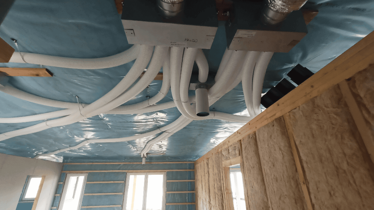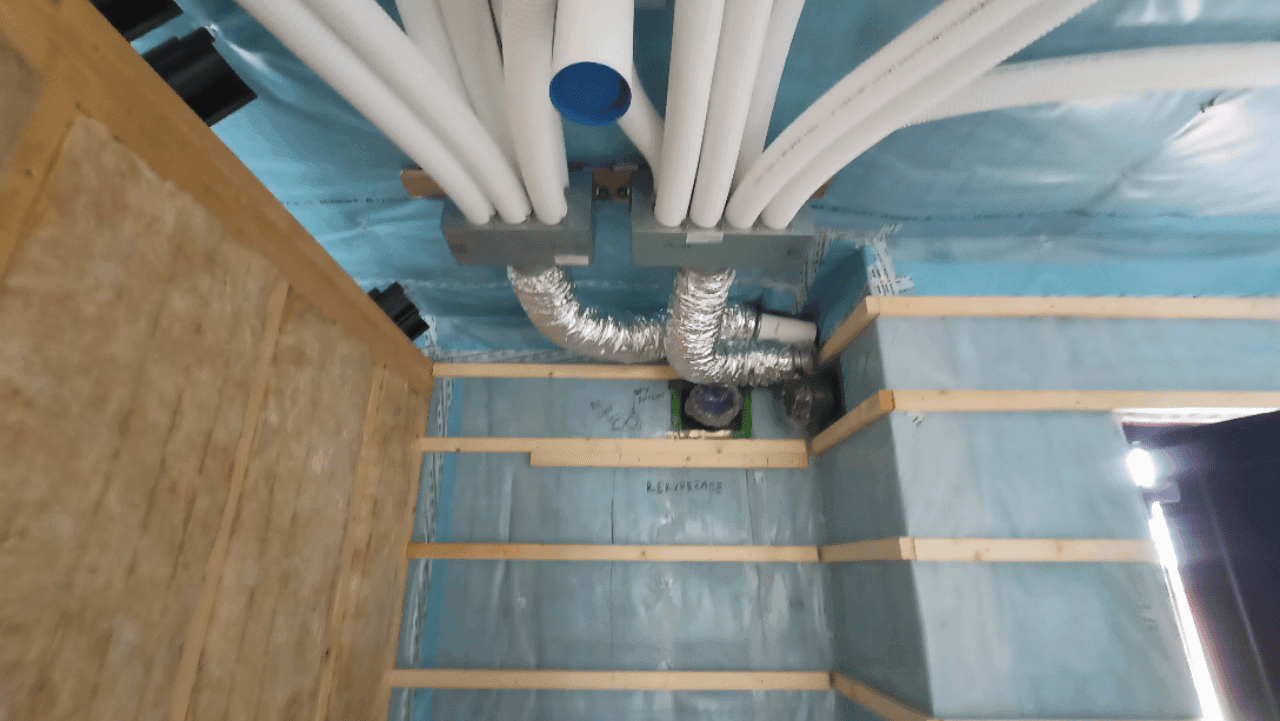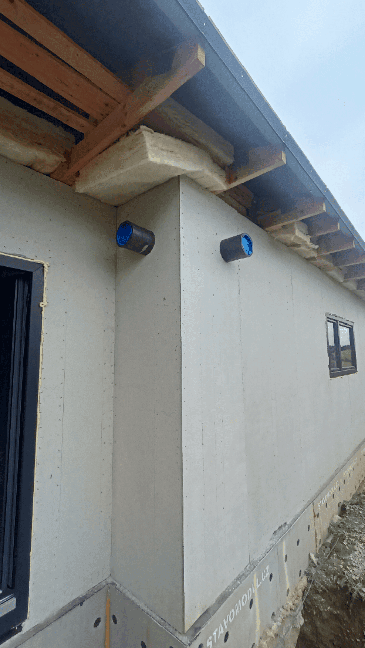 Novostavba dvou rodinných domů ve městě Břeclav, trasování potrubí v ploché střeše.