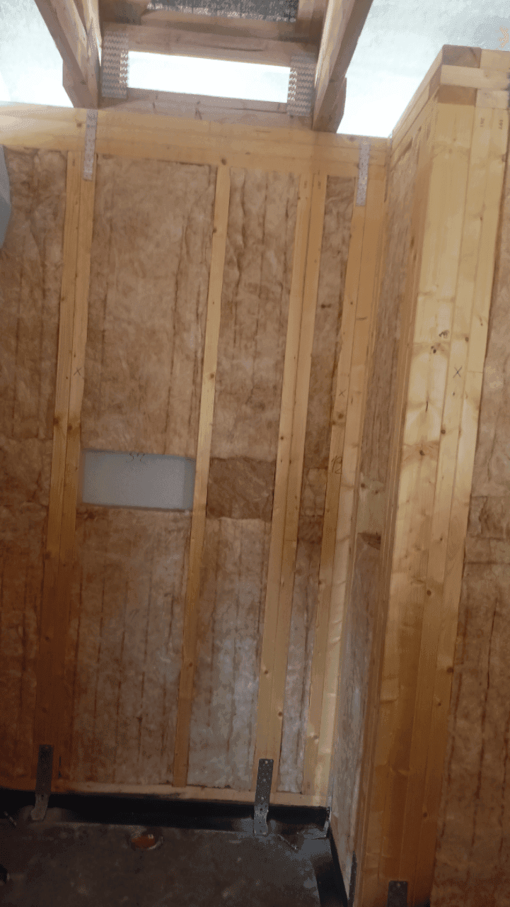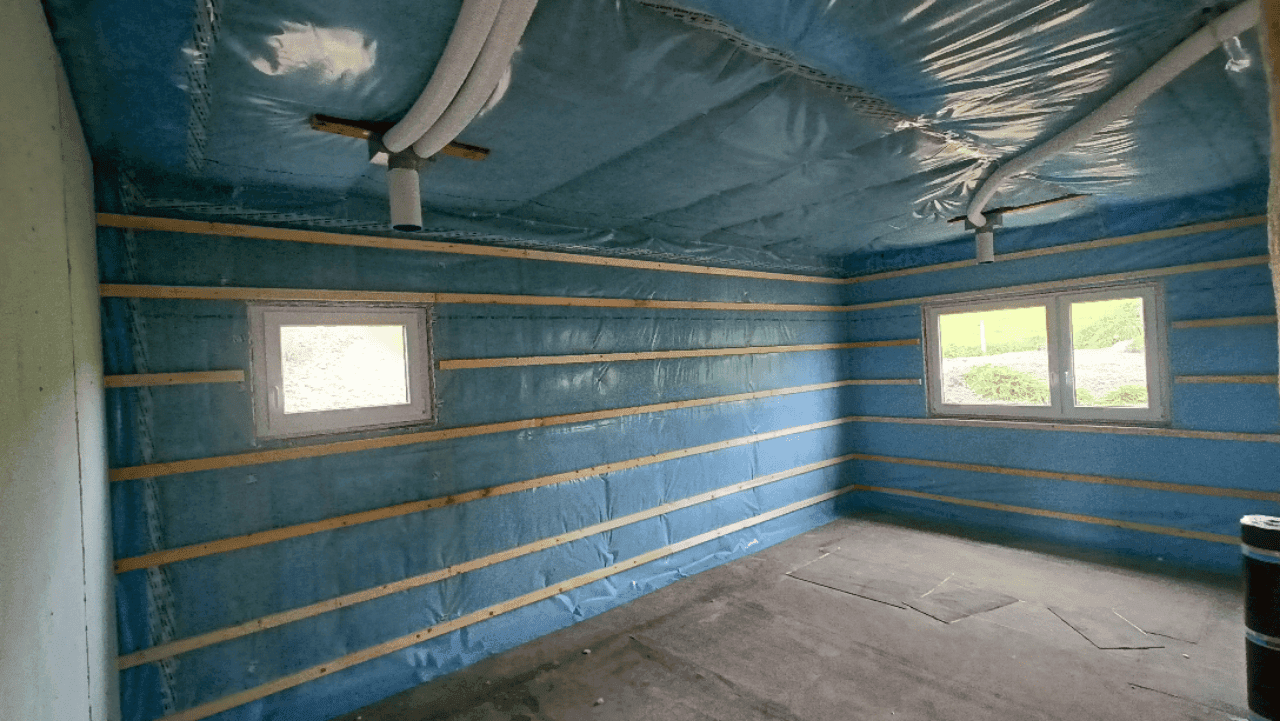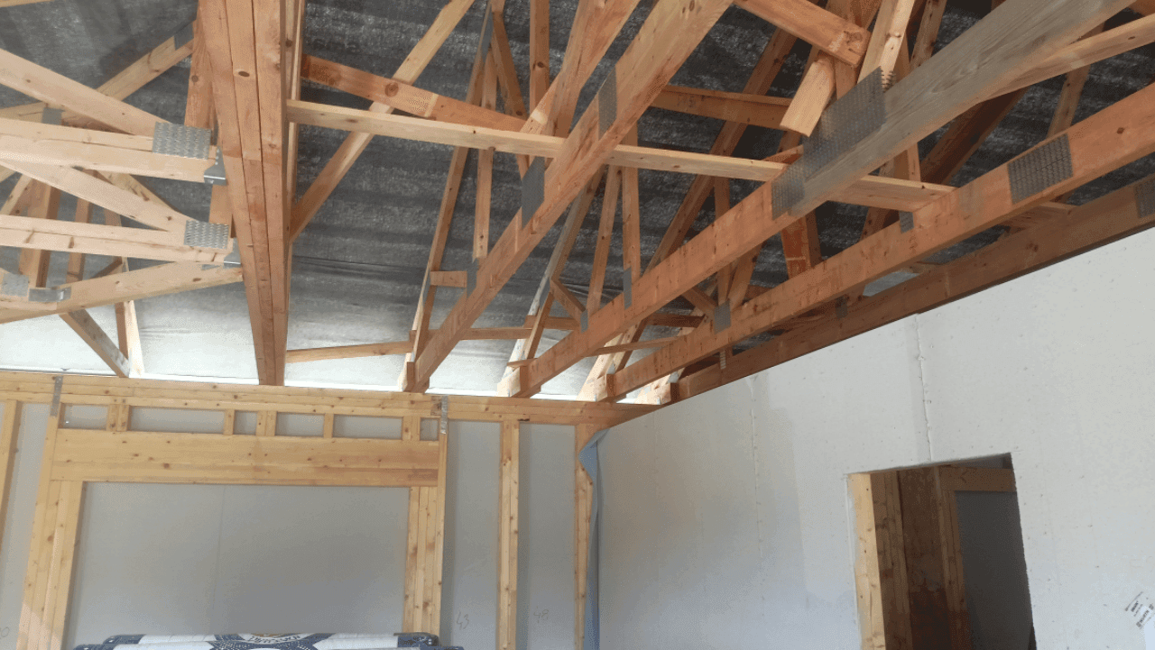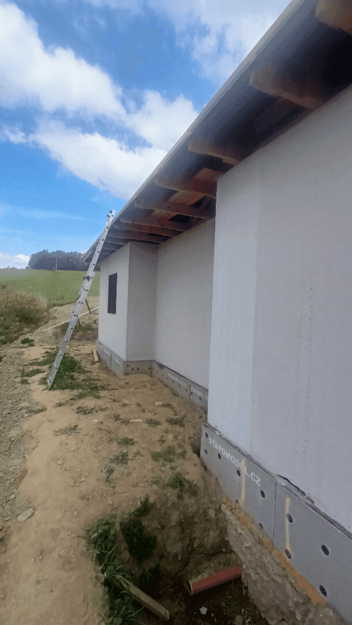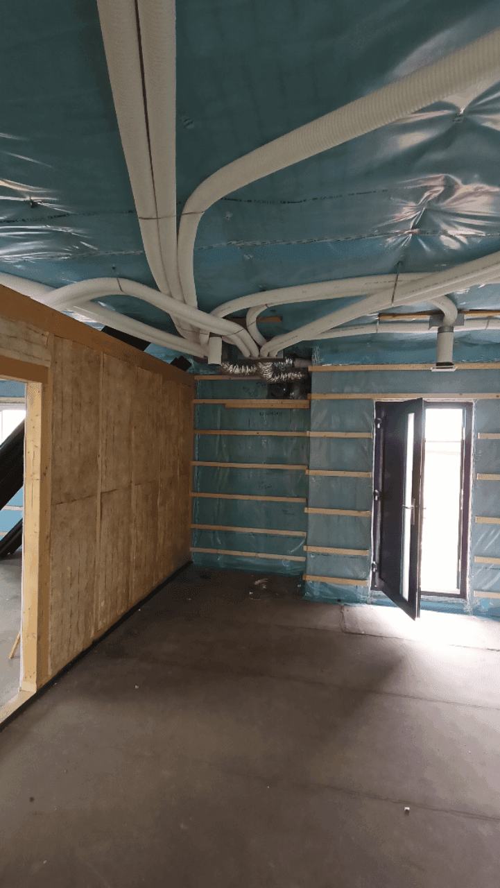 Novostavba dvou rodinných domů ve městě Břeclav, trasování potrubí v ploché střeše.