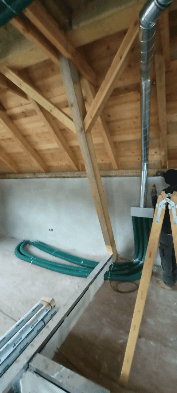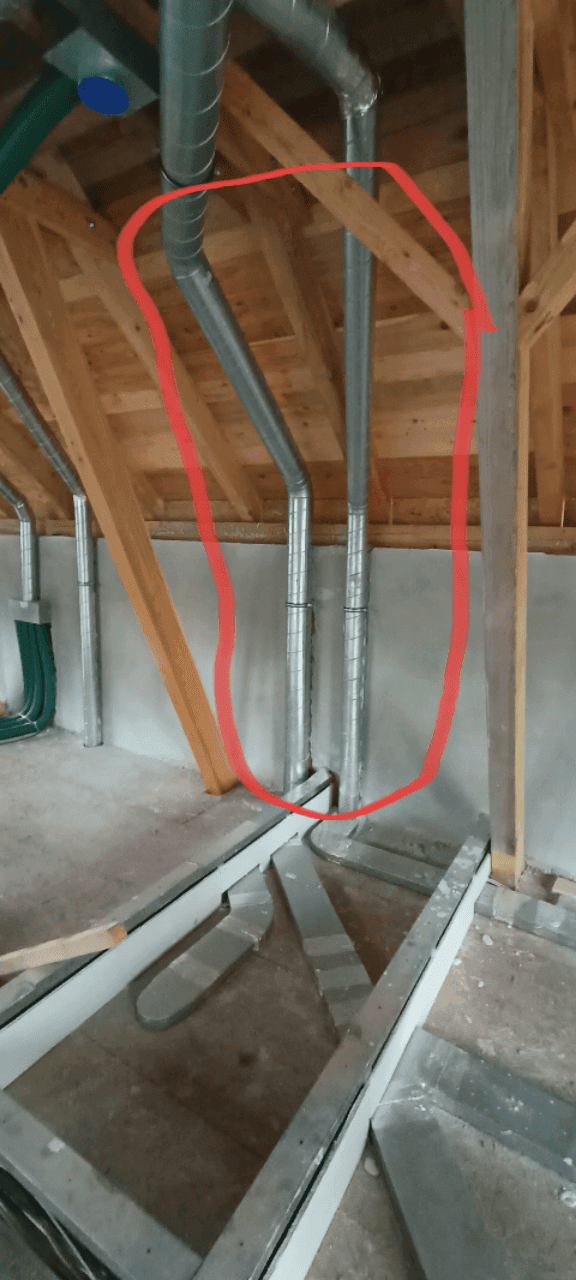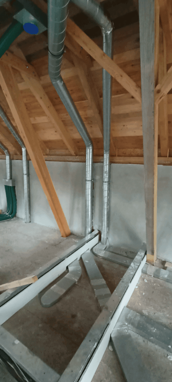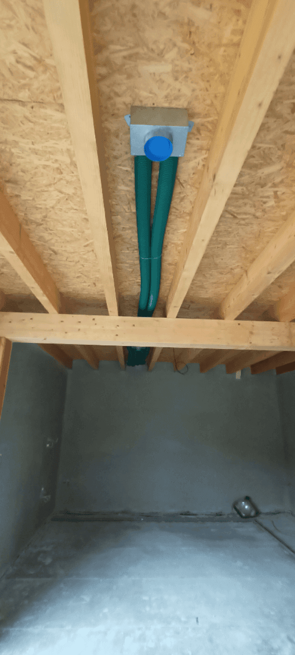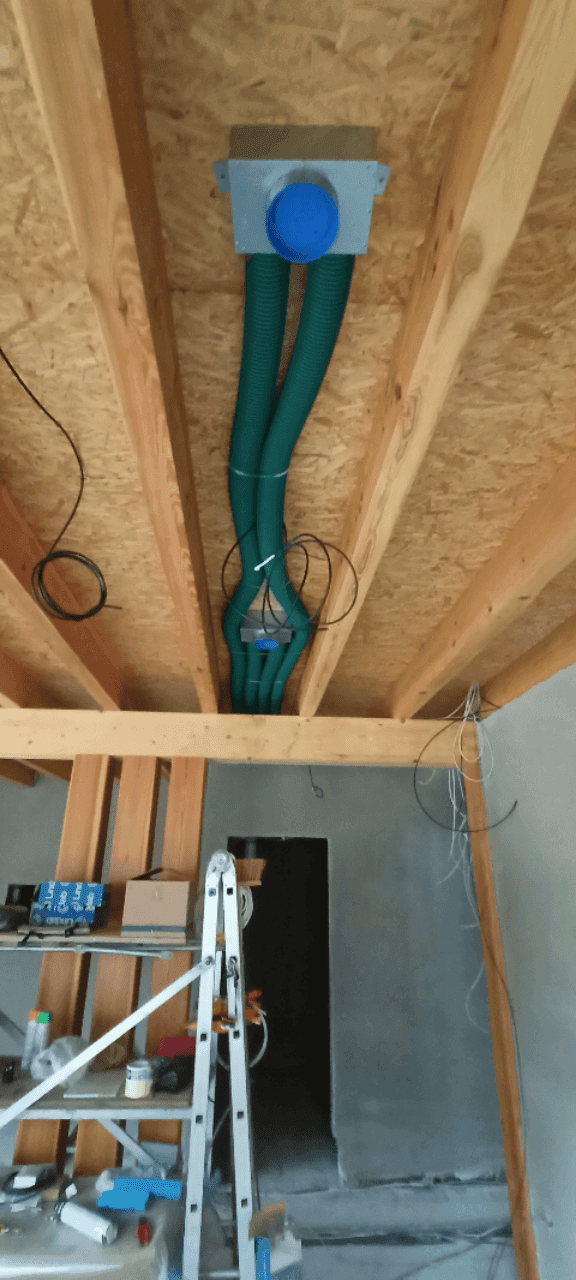 Novostavba dvou rodinných domů ve městě Břeclav, trasování potrubí v ploché střeše.