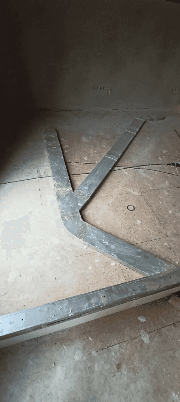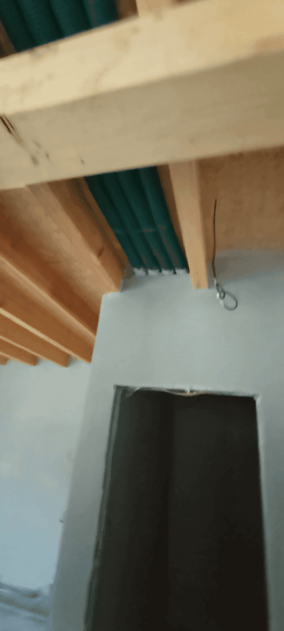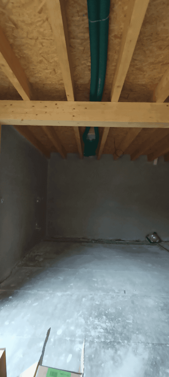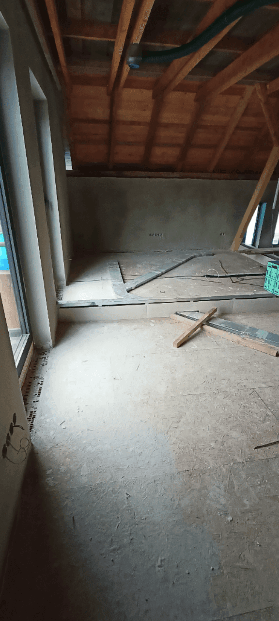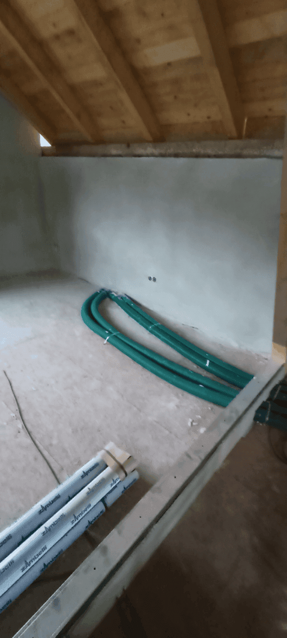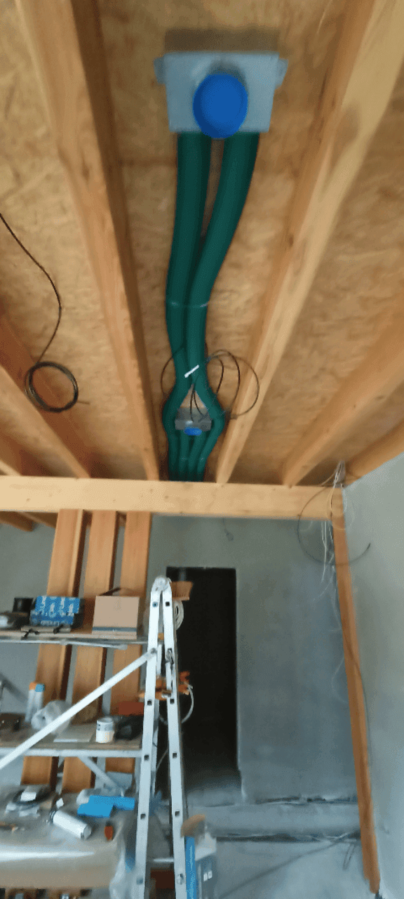 Novostavba dvou rodinných domů ve městě Břeclav, trasování potrubí v ploché střeše.