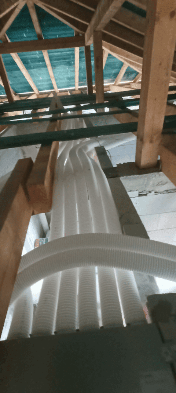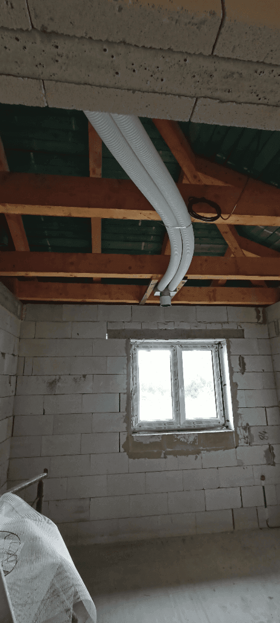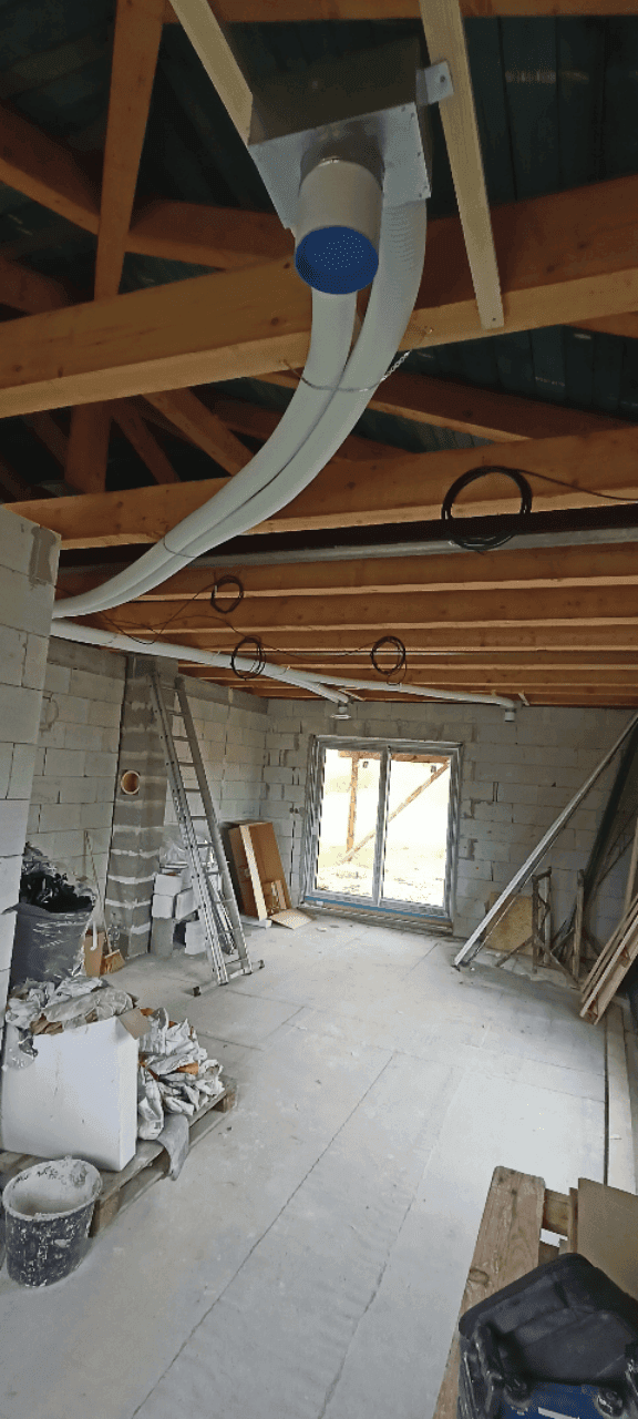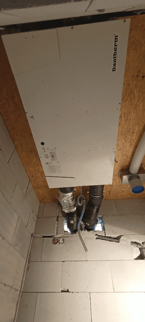 Novostavba RD – vzhledem k malé technické místnosti, jednotka Dantherm umístěna v podhledu. Toto řešení šetří tolik potřebný prostor v domě.