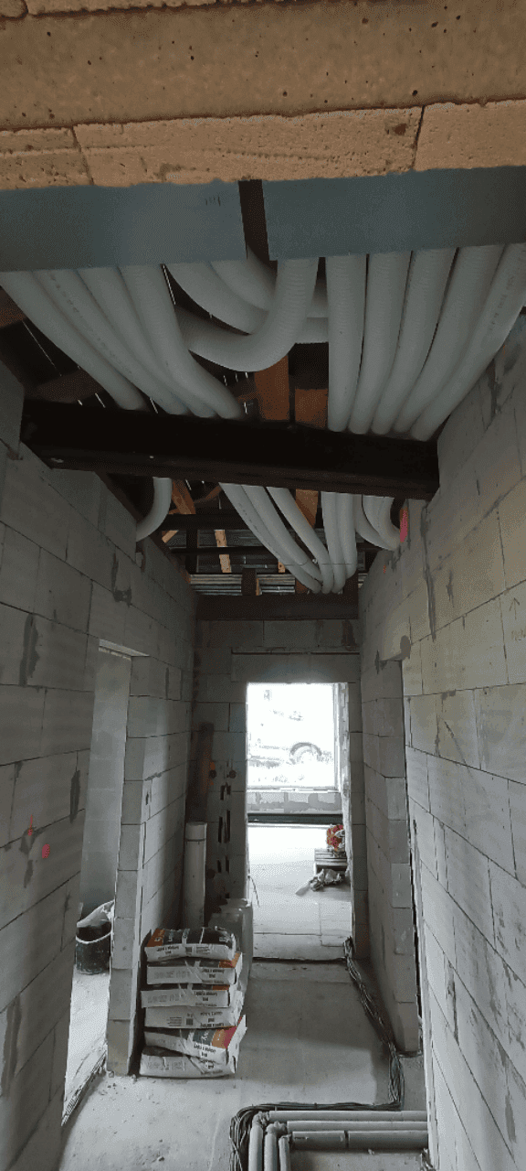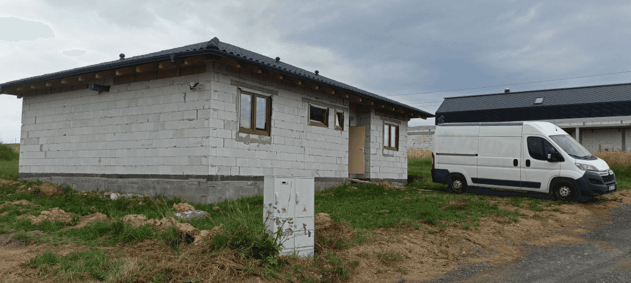 Novostavba dvou rodinných domů ve městě Břeclav, trasování potrubí v ploché střeše.