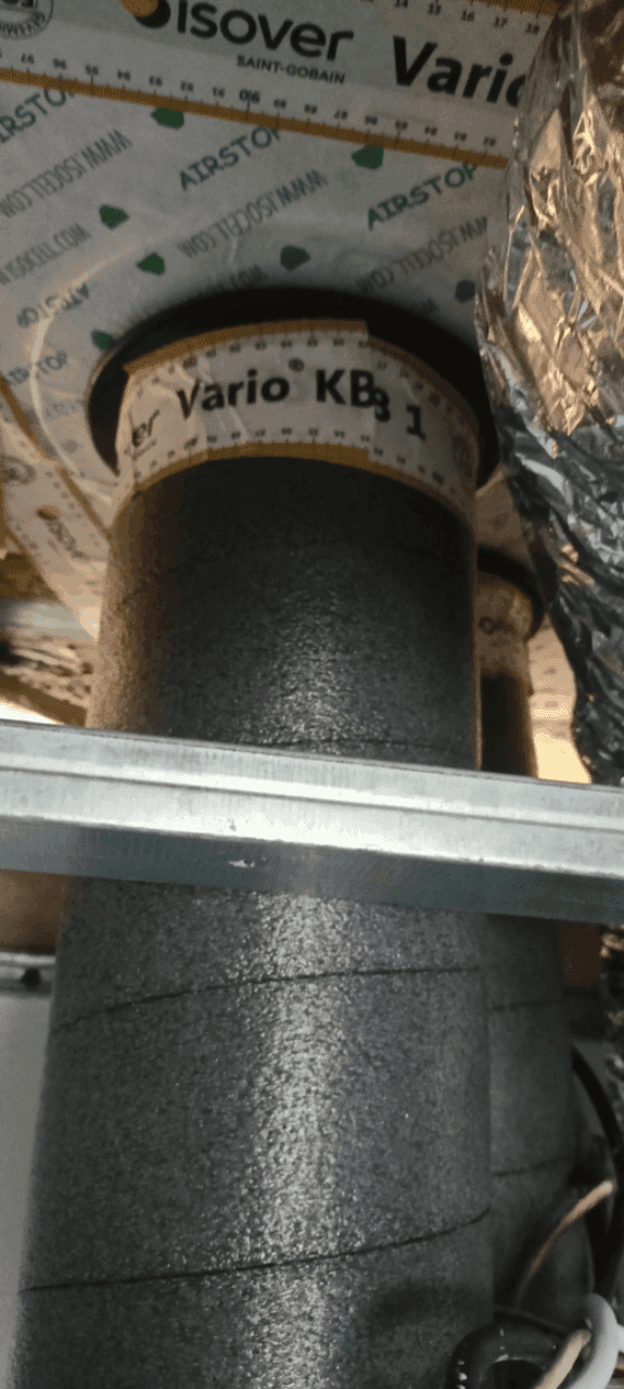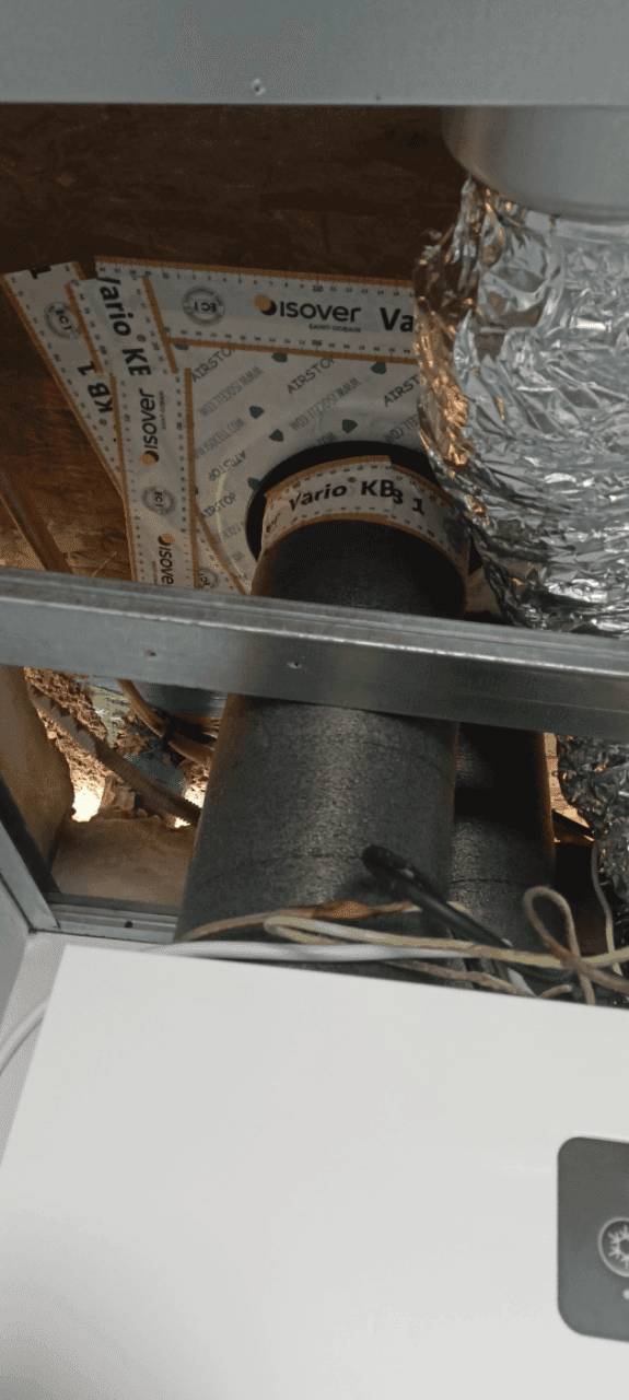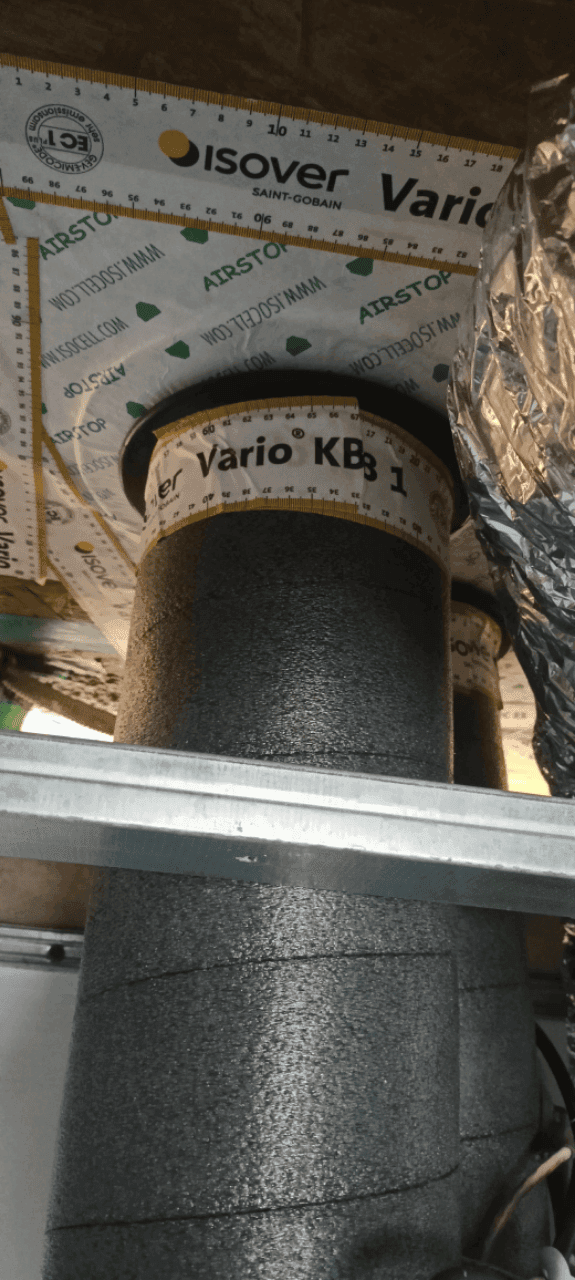 Novostavba dvou rodinných domů ve městě Břeclav, trasování potrubí v ploché střeše.