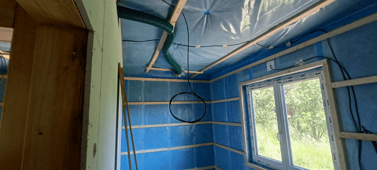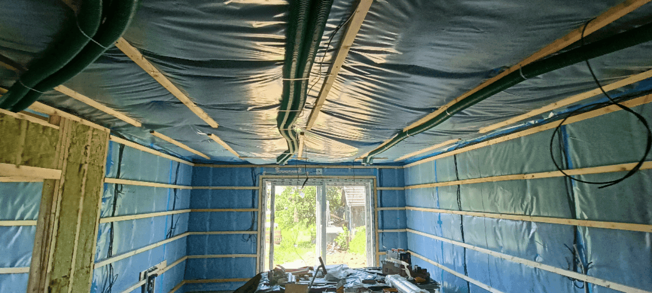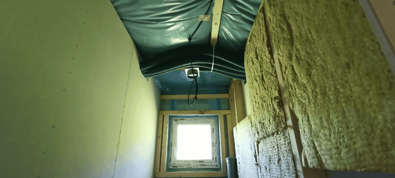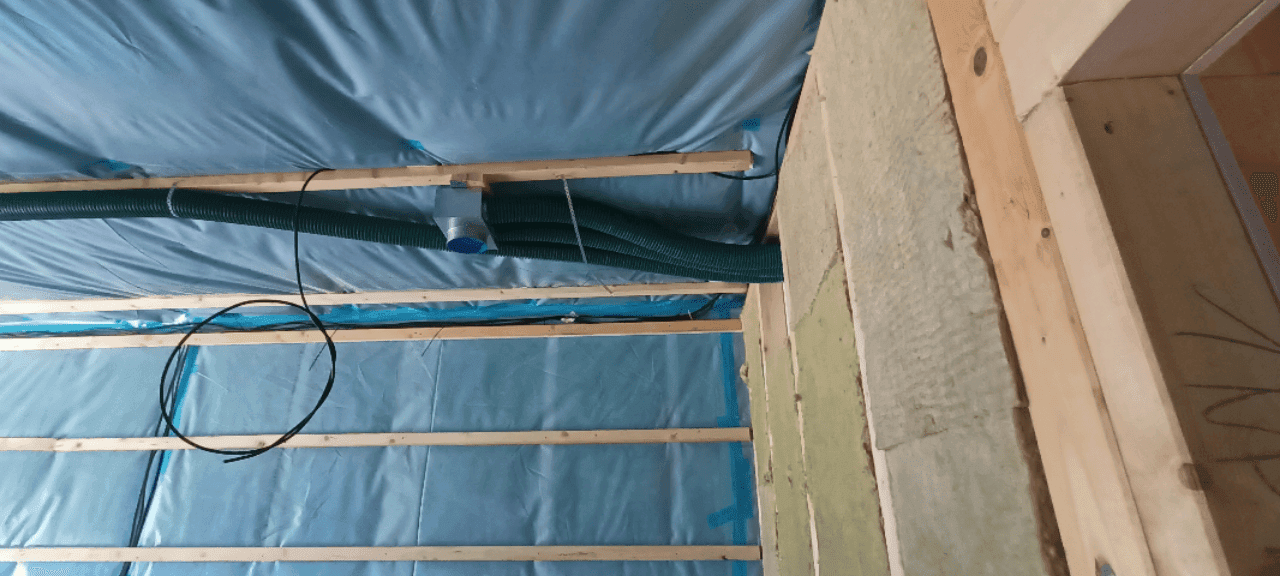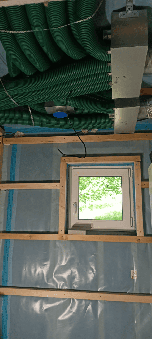 Novostavba dvou rodinných domů ve městě Břeclav, trasování potrubí v ploché střeše.